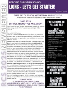 Stay informed with the latest announcements, upcoming events, and important reminders from Redding Christian School. This page will be updated regularly as new information becomes available. Be sure to check back often, and don’t forget to reach out to your teacher directly for any class-specific updates or questions.