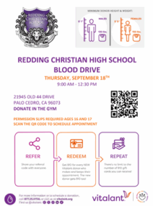 We invite and encourage all eligible parents and students age 16 and older to participate in this important event. Your donation can make a life-changing difference in someone’s life—and it’s a powerful way to serve others together as a school community. Check out the flyer below for details and the QR code to register!