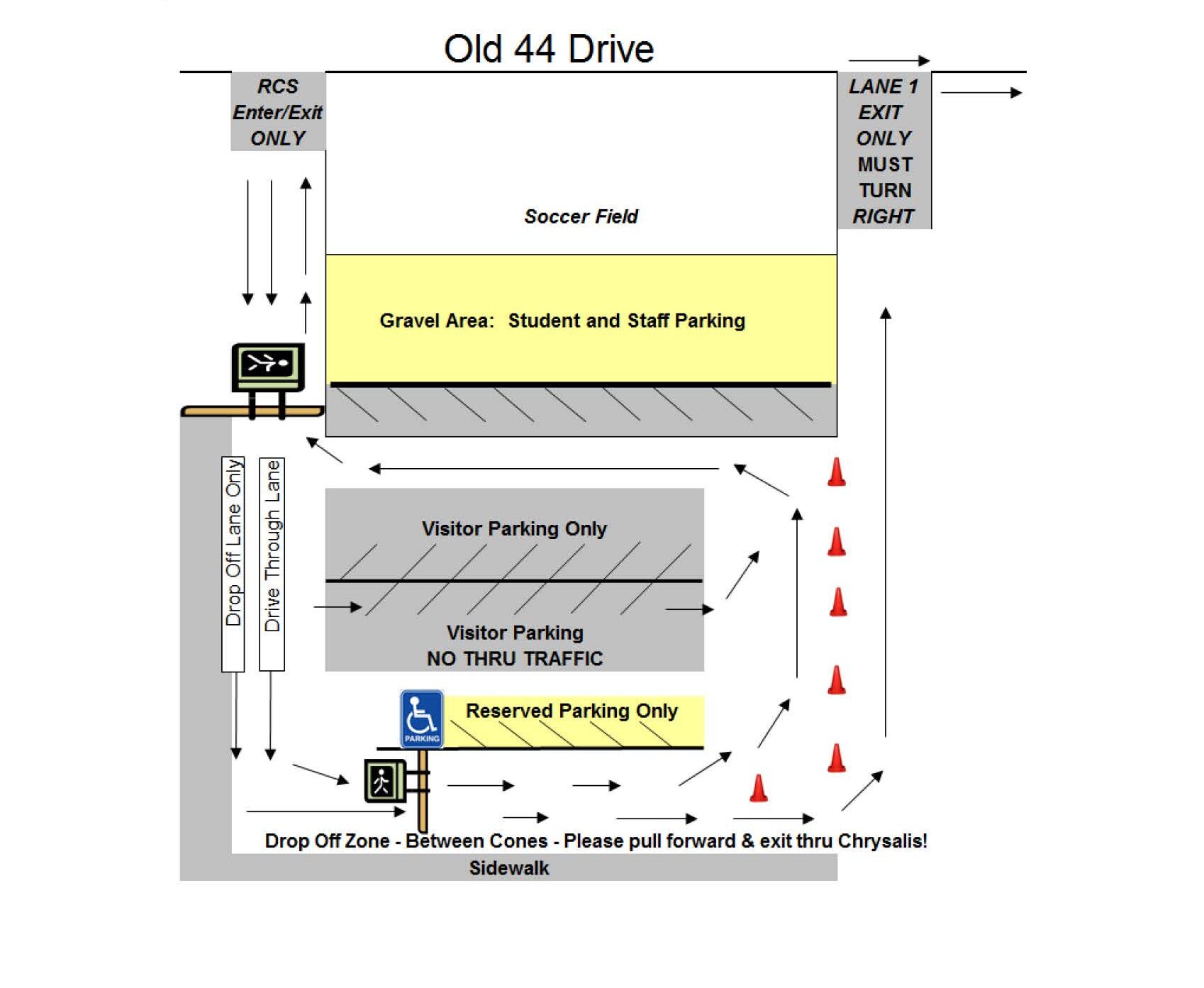 CURB SIDE DROP OFF: If you plan on dropping your children off at the curb, stay in the right hand lane closest to the curb and pull all the way forward toward the crosswalk before allowing your student to exit the vehicle. Please do not let them exit on the driver’s side. To exit after curbside drop off, please proceed and exit through the Chrysalis entrance/exit. Be sure to stop at the sign at the edge of the cones before pulling in front of any oncoming traffic for Chrysalis. Parents must turn right on Old 44 when exiting from the Chrysalis entrance/exit.
